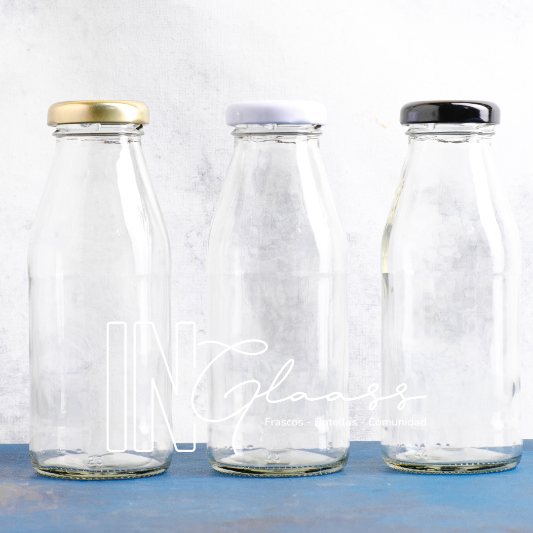 Botella de vidrio de 250 cc con tapa, ideal para conservar y comercializar, jugoss, salsas y cremas.